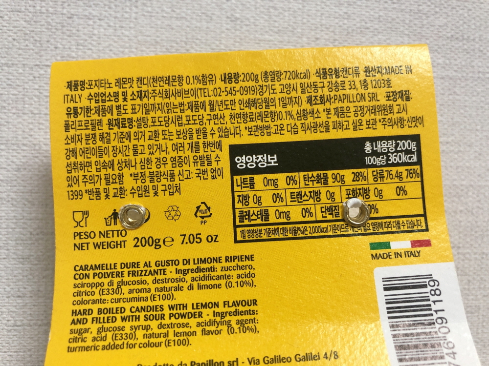 원재료명 : 설탕,포도당시럽,포도당,구연산,천연향료(레몬향)0.1%,심황색소